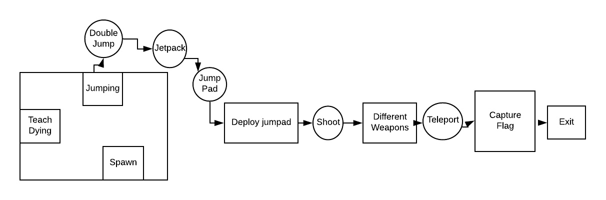 Since this is a multiplayer game, I designed the training level like a sandbox but with linear placements of the game mechanics, where the player can go back and forth through the level and try out the movement mechanics, weapons, and even capture the flying flag at the end of the level. Players can spend as much time as they want in training. We also had enemy dummies created by our programmers that the player could use the weapons on and see how each weapon was different from each other. I used the Fungus tool to provide in-game tips and instructions to the user and also used it to visually program a waypoint system to guide players.